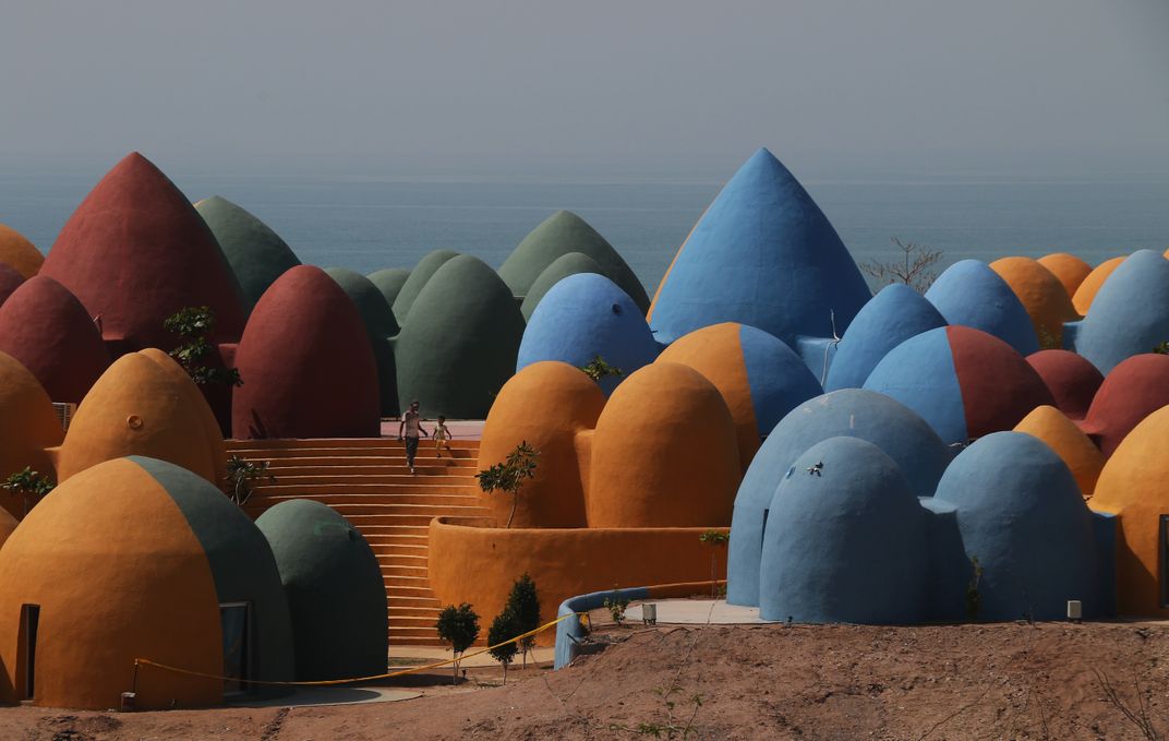 A worker and his son walk past a charming, newly built hotel on the Gulf of Hormuz, Iran