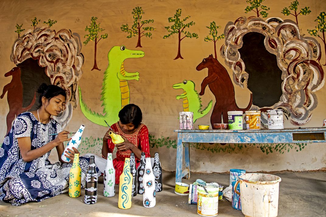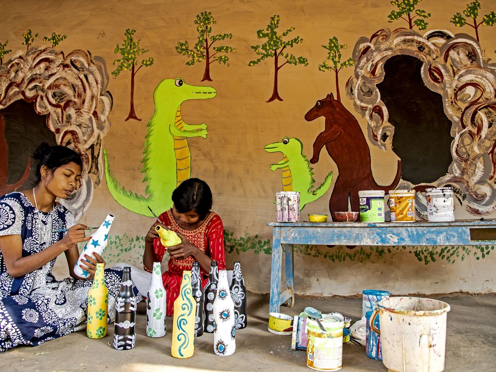 In an artist village, women paint bottles with vibrant designs, sitting before a mural of playful animals. Their focus and creativity bring everyday objects to life, celebrating rural artistry in a burst of color and imagination.