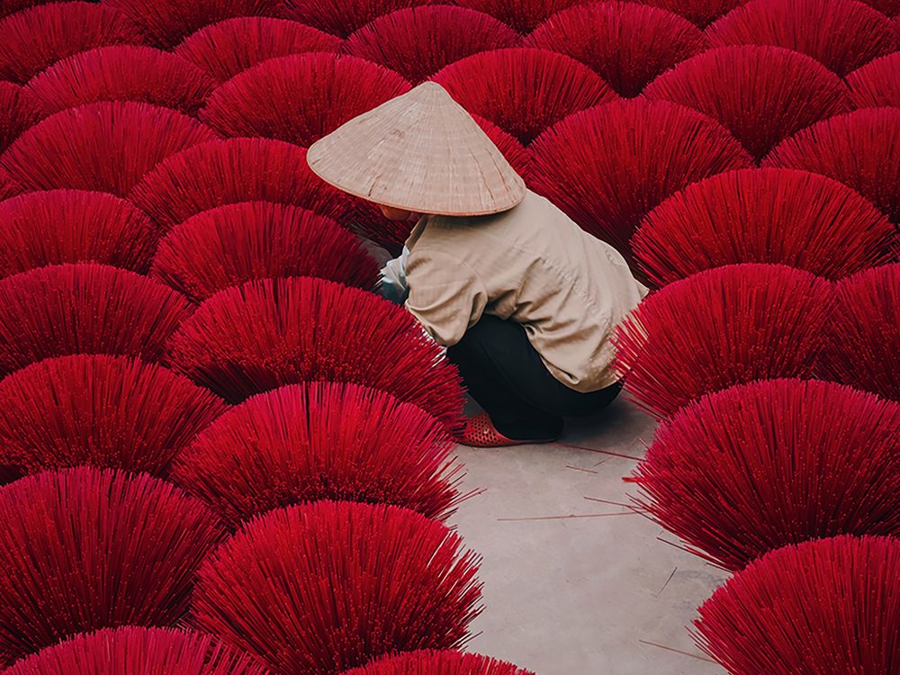 Worshiping ancestors is an important part of Vietnamese culture. Most houses have an altar where they burn incense. Quang Phu Cau has long been one of the largest incense stick makers in Vietnam. Bamboo Wood is cut into small rods, then sticks. After that, sticks are dyed and dried out in the sun. This moment is the colorful scene you see here. Most of them are dyed in red nuances, since red is a symbol of luck and happiness. In order to speed up the drying process, workers tie them in bundles and spread each bundle to make sure the sticks get dried more quickly, like an umbrella. They are usually dried in the courtyard. When they have a lot of orders, the incense sticks are dried in the street.