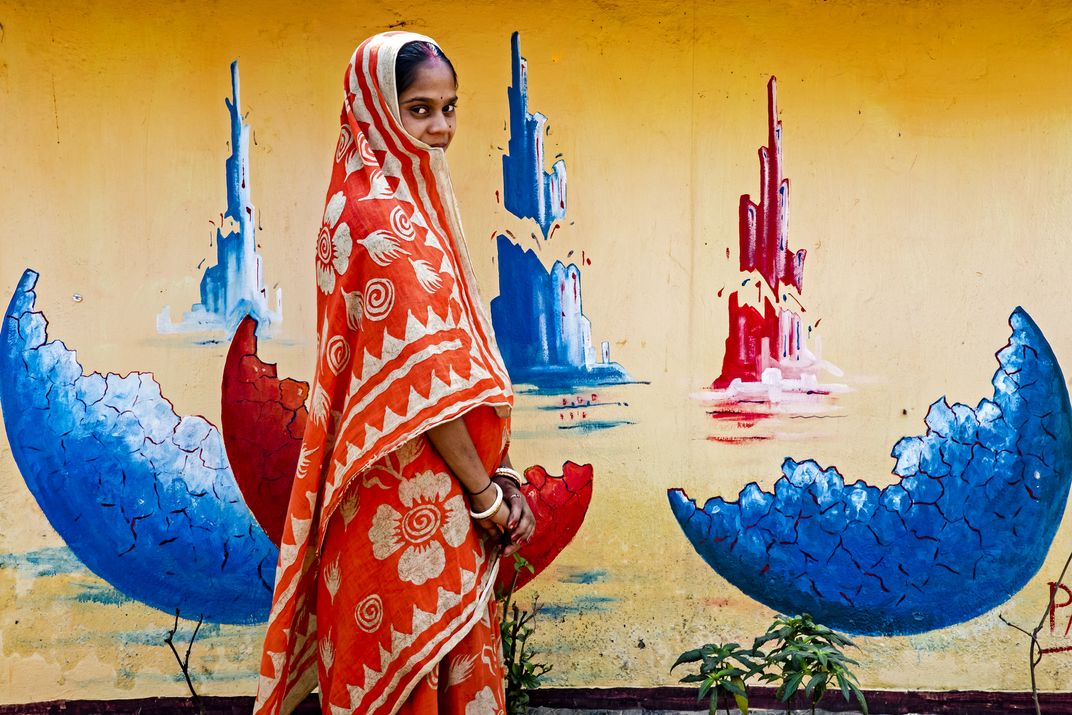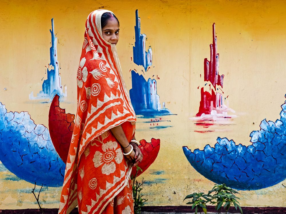 A shy housewife in vibrant orange stands gracefully against a mural of bold blues and reds. Her gentle gaze and traditional attire blend beautifully with the painted wall, capturing quiet elegance in rural Burdwan.