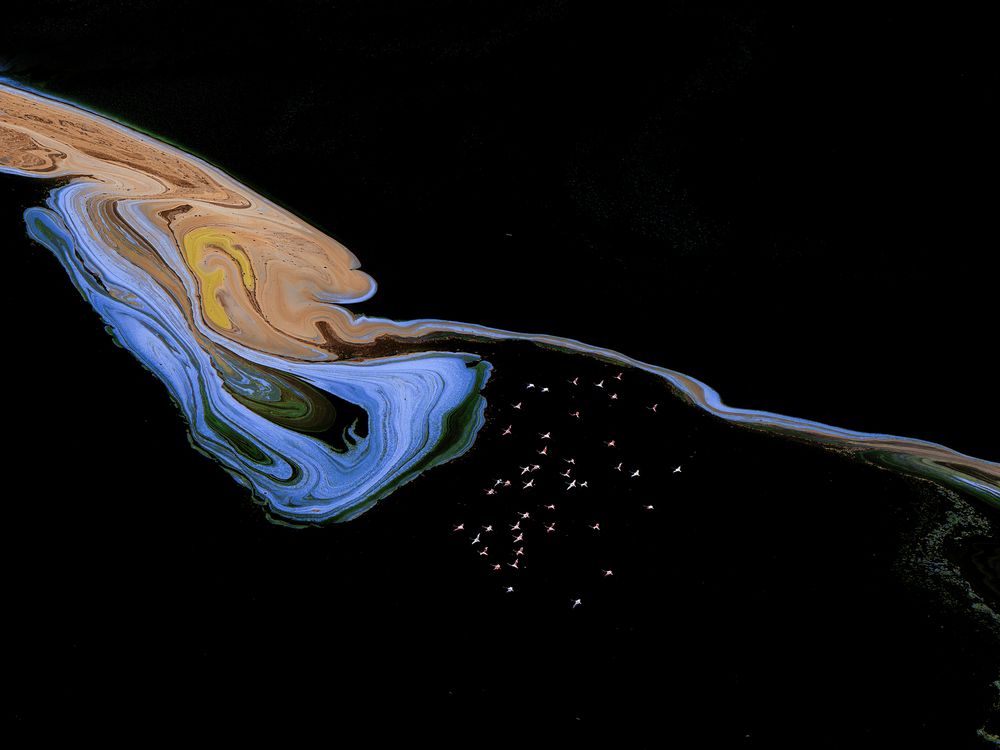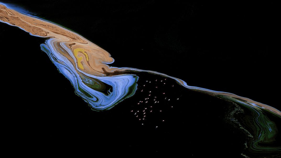 The salt of Lake Mecca mixes with the differently coloured carbonate compounds at the bottom of the lake to produce large, weirdly shaped, watercolour-like floating salt clumps, which form a variety of colourful and bizarre patterns under the action of weak cyclones and light. When the flamingos fly over the lake, it's like travelling through an ‘alien world’.