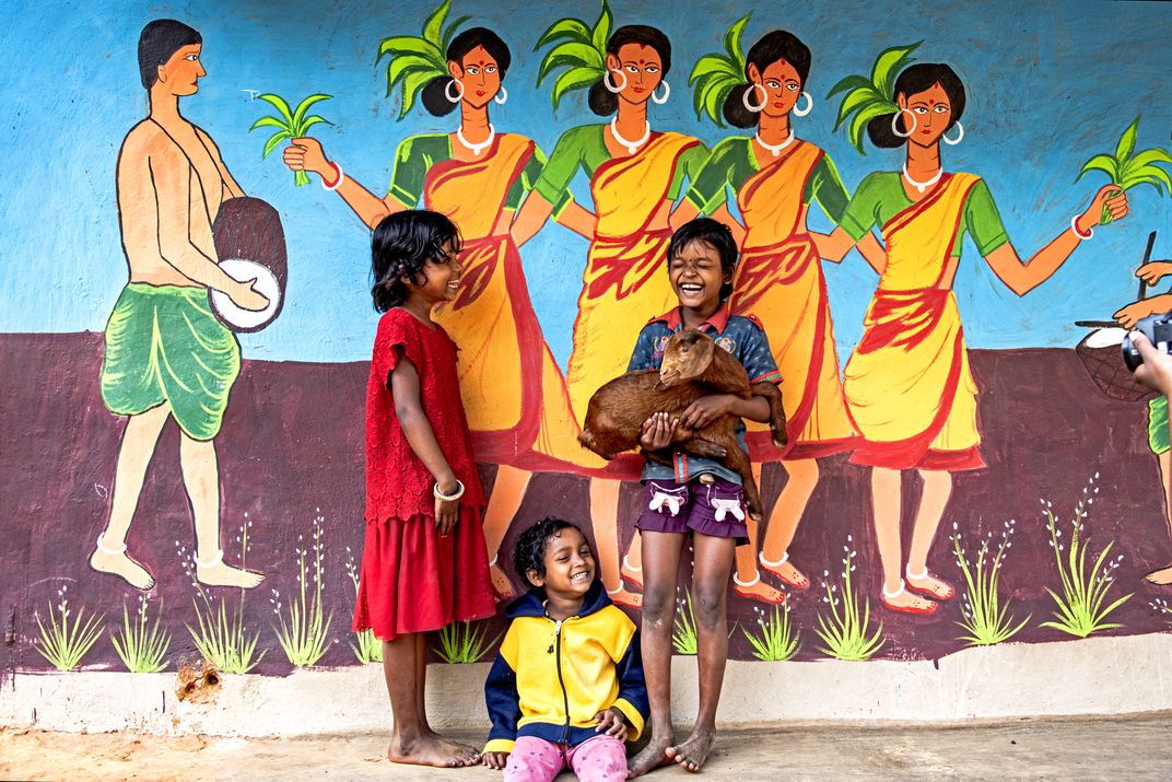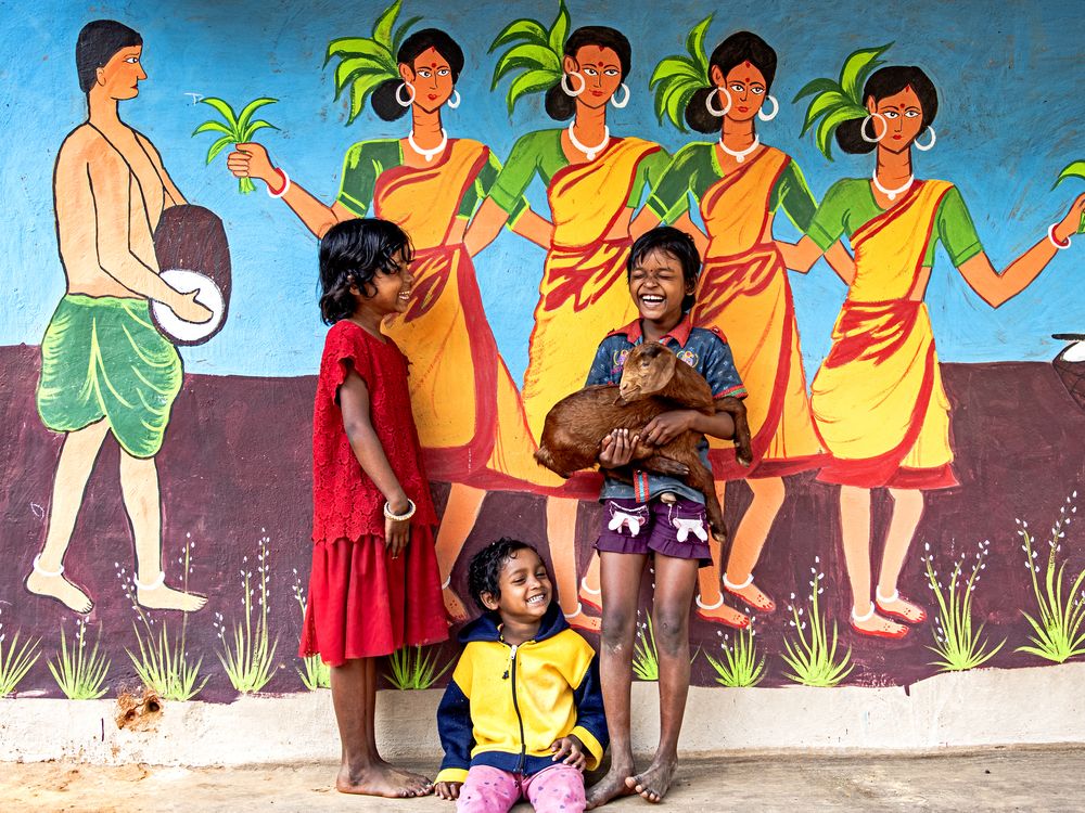 A group of children stands before a vibrant mural of traditional dancers, their joyful, curious expressions blending with the lively colors. The scene beautifully reflects how culture and everyday life inspire and uplift one another.