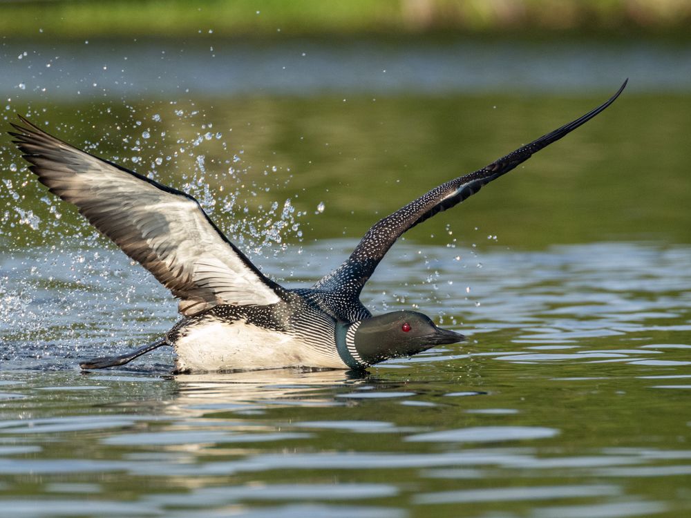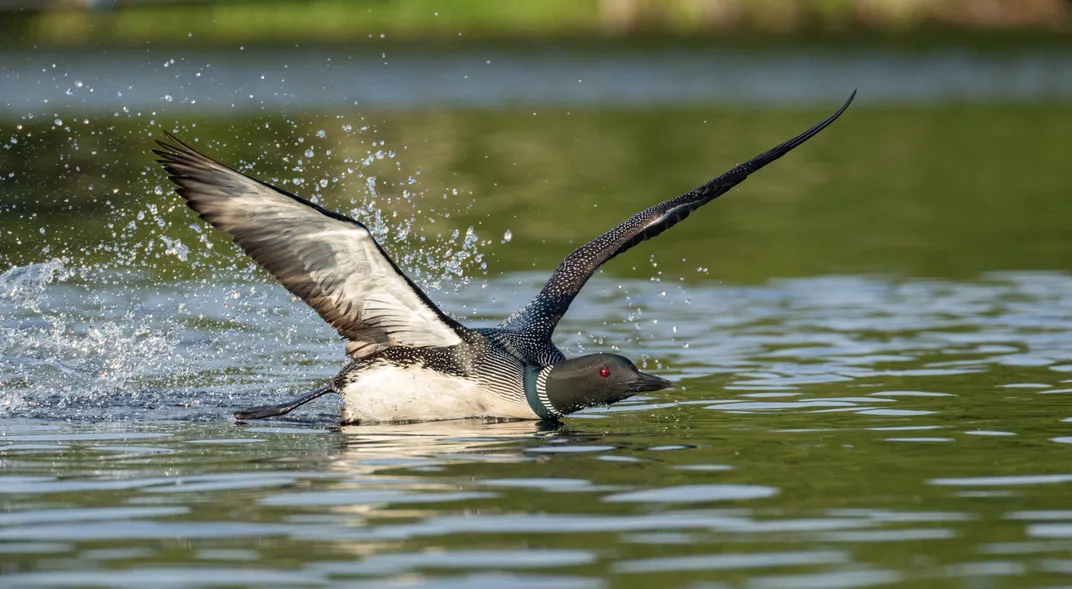 A male common loon had been swimming and diving with its mate when it suddenly began running across the surface of the lake as if to take-off. Instead of getting airborne, however, it glided across the water before coming to a stop not far from where I was sitting in a kayak.