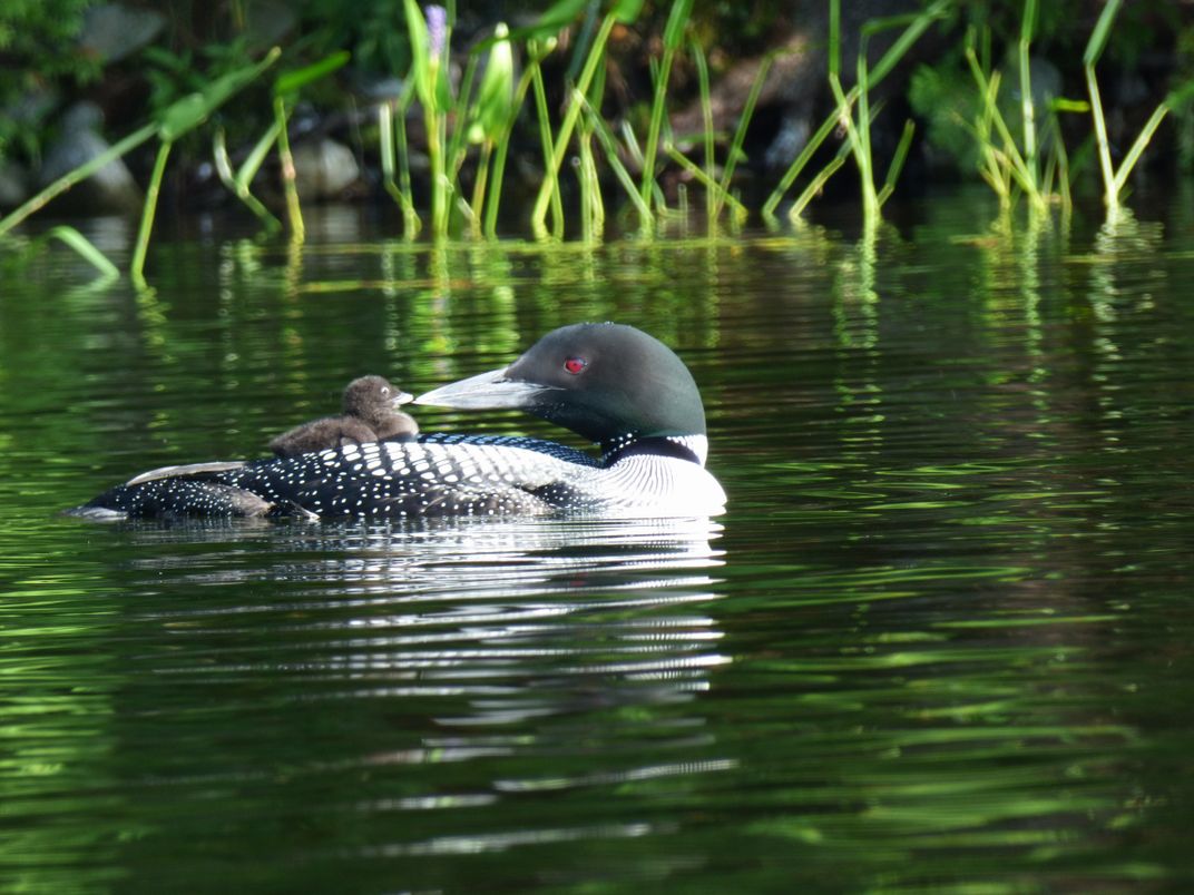 While kayaking in late July on Whetstone Pond in Maine, I saw a pair of loons and decided to try and photograph them. As I was zooming in, I saw the tiny baby loon with them. No babies had been seen all summer so I was very happy to see this one. Eventually I saw the baby climb onto the parents back and was lucky enough to get this shot of them face to face.