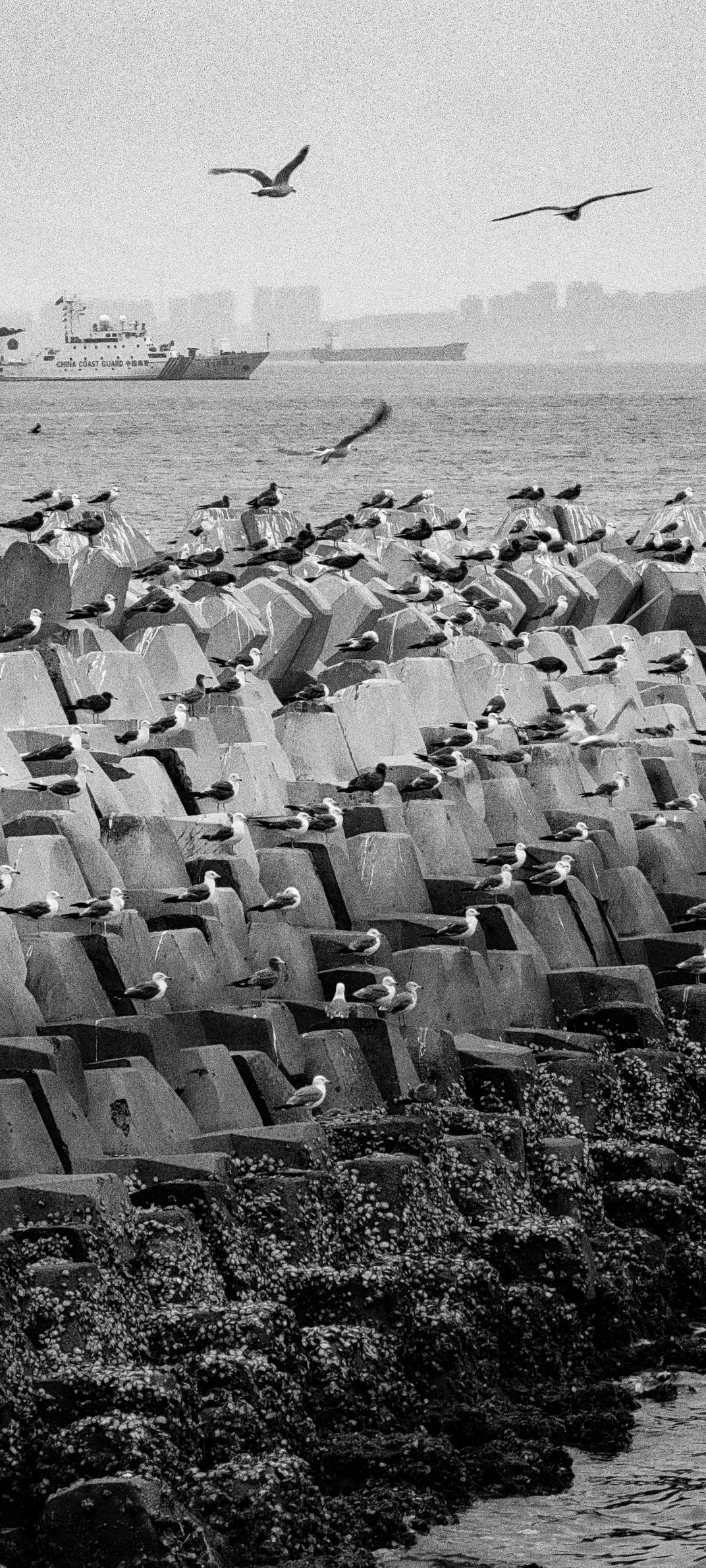 Hundreds of seagulls stand neatly on the shore, their eyes looking in the same direction, signalling their highest salute to the people.