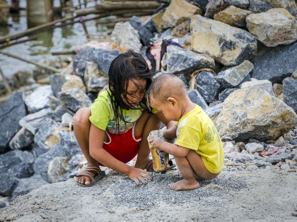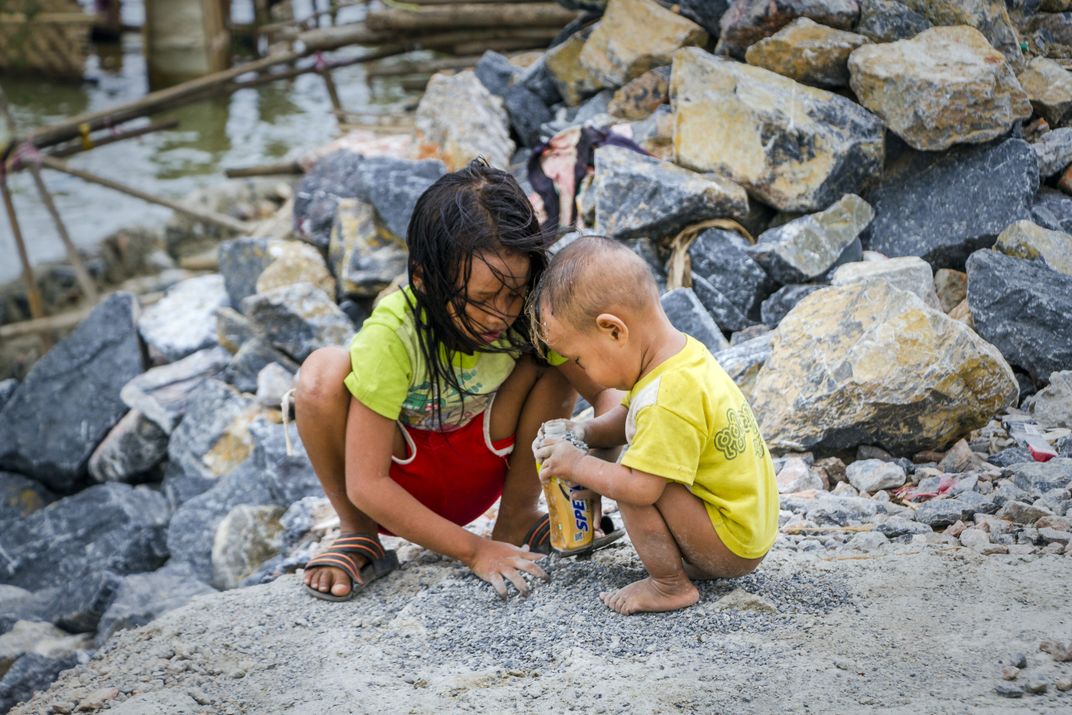 Two children playing at the side of Irrawaddy river.