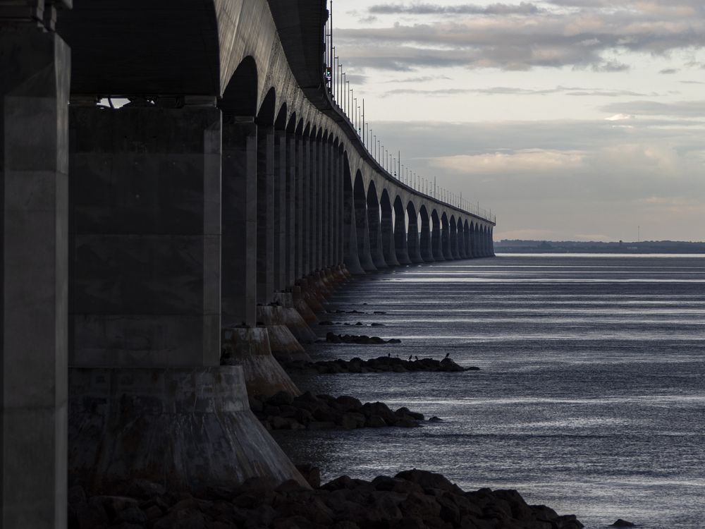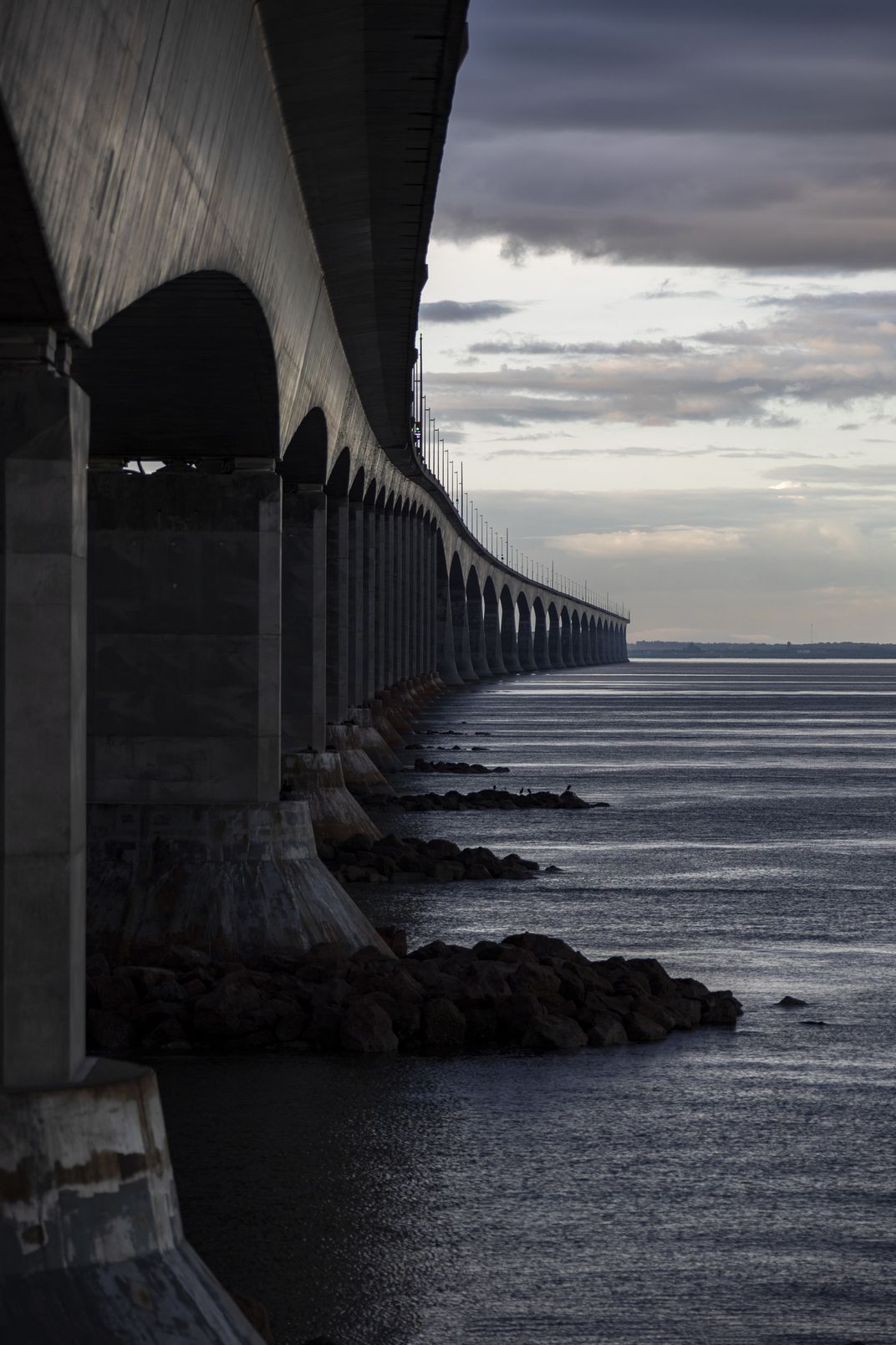 Confederation Bridge is the world's longest bridge over water that ices-over, and connects New Brunswick to Prince Edward Island in eastern Canada. The sky was dark from a rain storm that just passed by.
