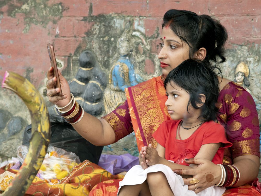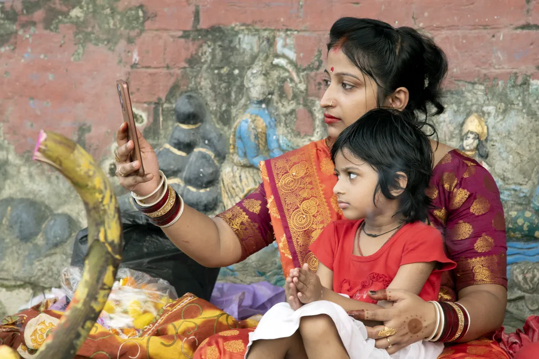 A devotee at Kolkata’s Chhath Festival balances tradition and technology, video-calling while holding her child. The vibrant attire and sacred setting blend beautifully with this tender, modern moment.