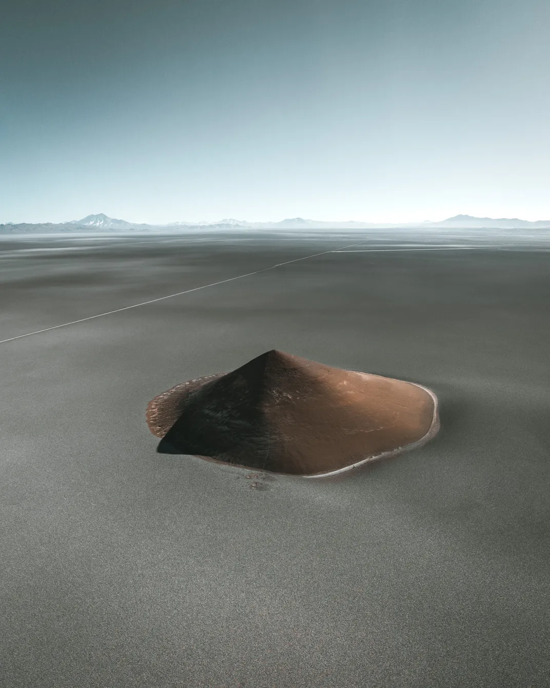 Cono de Arita rises like a perfect pyramid above the salt flats of Argentina’s remote Puna de Atacama. Formed by volcanic activity, it stands solitary against the vast Salar de Arizaro. It almost looks artificial in its totally flat surroundings with no other elevation around, which makes it incredibly interesting for aerial drone compositions.