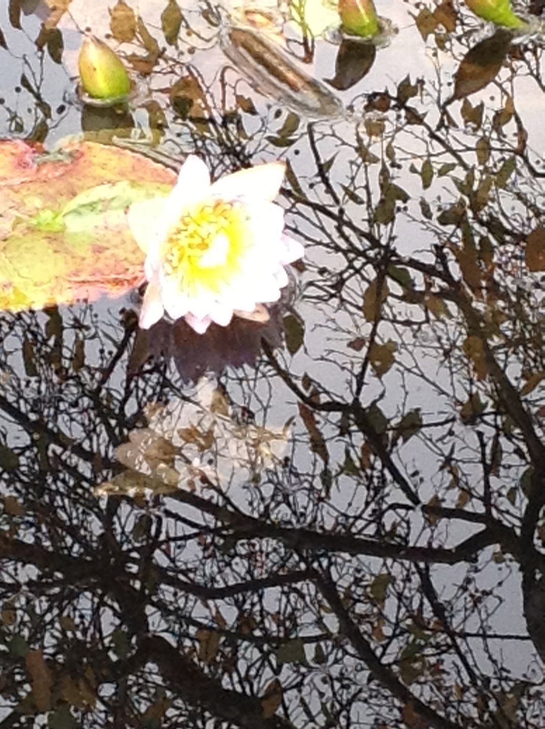 Conservatory fountain reflection, misty day.