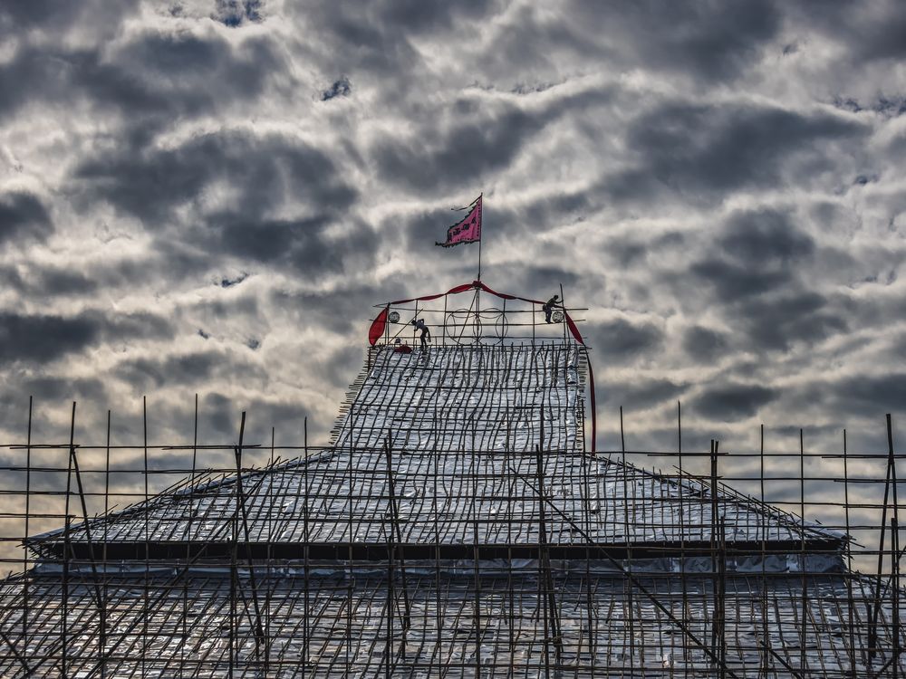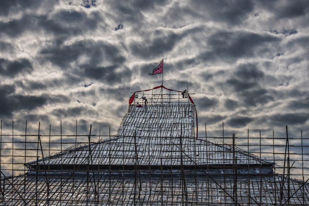 Workers in Hong Kong are setting up bamboo opera stages for an upcoming festival.