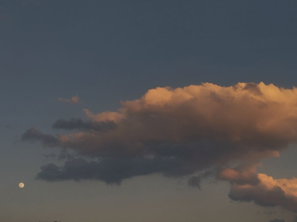 This is one of those sunsets near the full moon, featuring two-tone clouds. I like their two-tone nature because it suggests that there is no absolute existence. If one side of it is experiencing the fleeing sun, the other side is waiting for the calm of the night and the arrival of the moon.