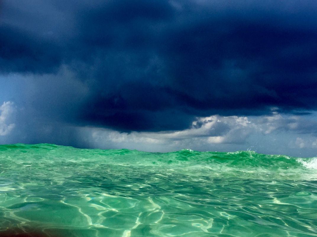 The photo represented is showing the Emerald Coast waters with a wave swell at eye level. The dark looming clouds hung over ahead as a storm in the ocean started to move towards shore.