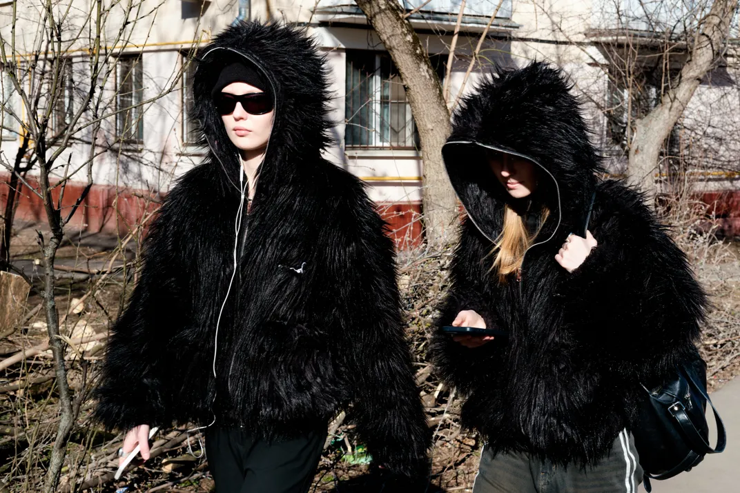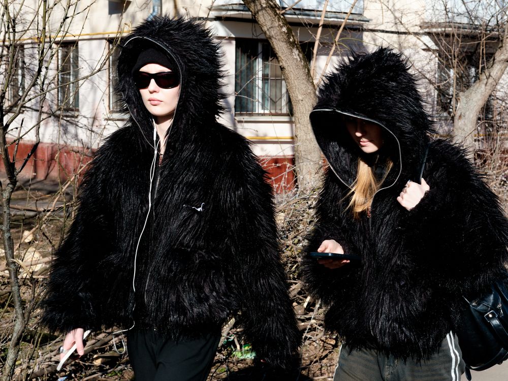 Two girls walking down the street of residential aria in Russia in a fashion way