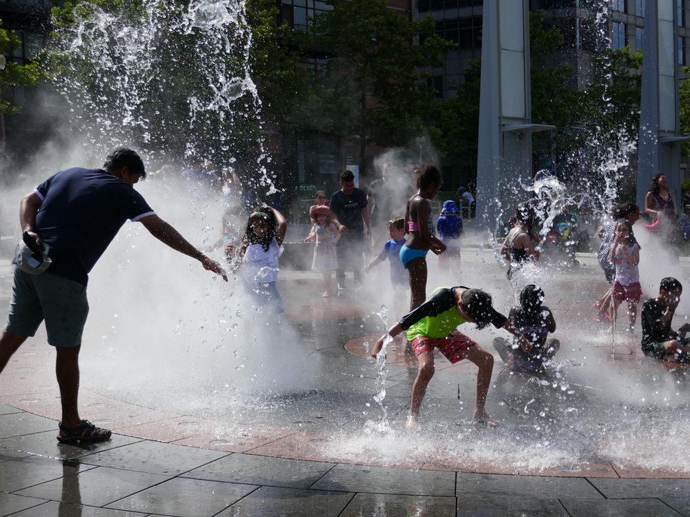 During the second summer of the pandemic, public fountains are operating again inviting both the young and young at heart to enjoy the simple pleasure of getting wet on a hot summer day.
