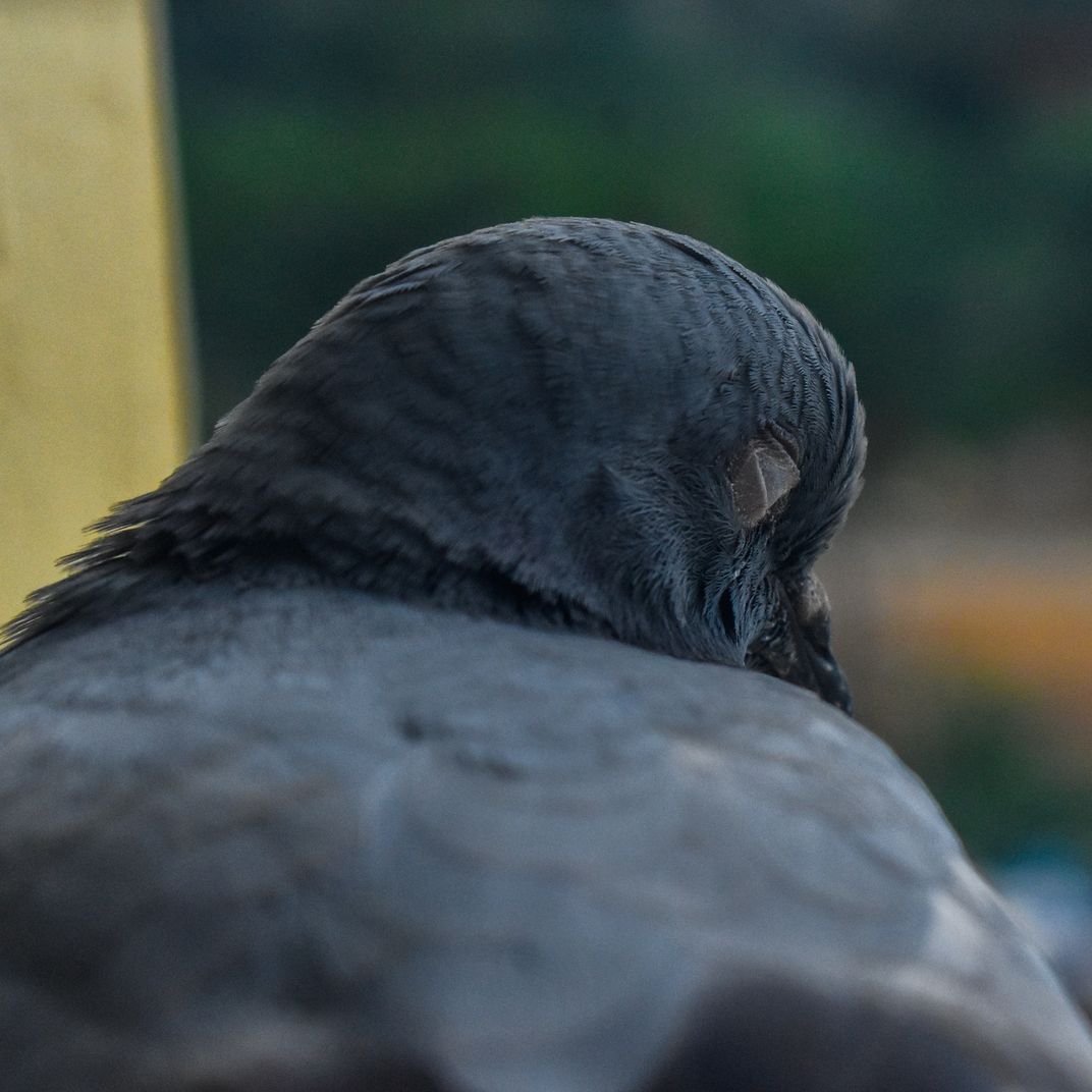 This intimate portrait captures a rock dove in a moment of peaceful slumber. Its head is tucked in, and its eye is partially closed, suggesting a deep state of rest.
