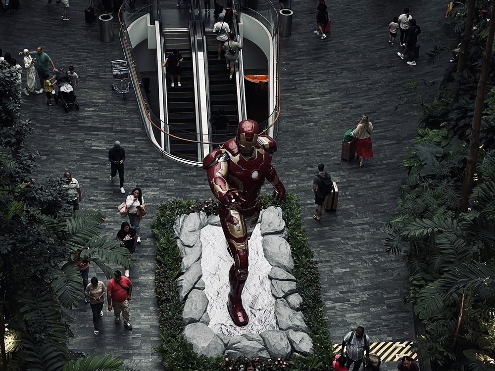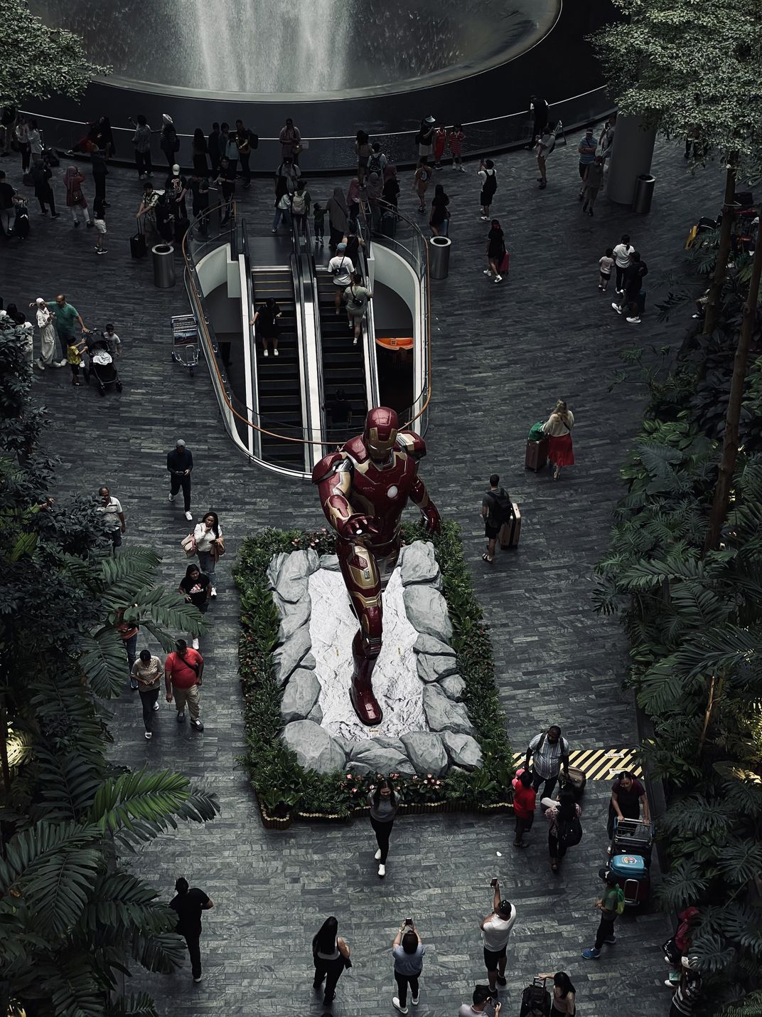 Photographed from an upper floor, this scene shows a towering Iron Man statue standing at the center of a lush, indoor garden space, surrounded by visitors pausing to take photos. Below the cascading waterfall in the background, people move between levels via the escalators, creating a sense of motion around the still, heroic figure. The image captures the blend of nature, architecture, and pop-culture spectacle that draws crowds into this vibrant public space.