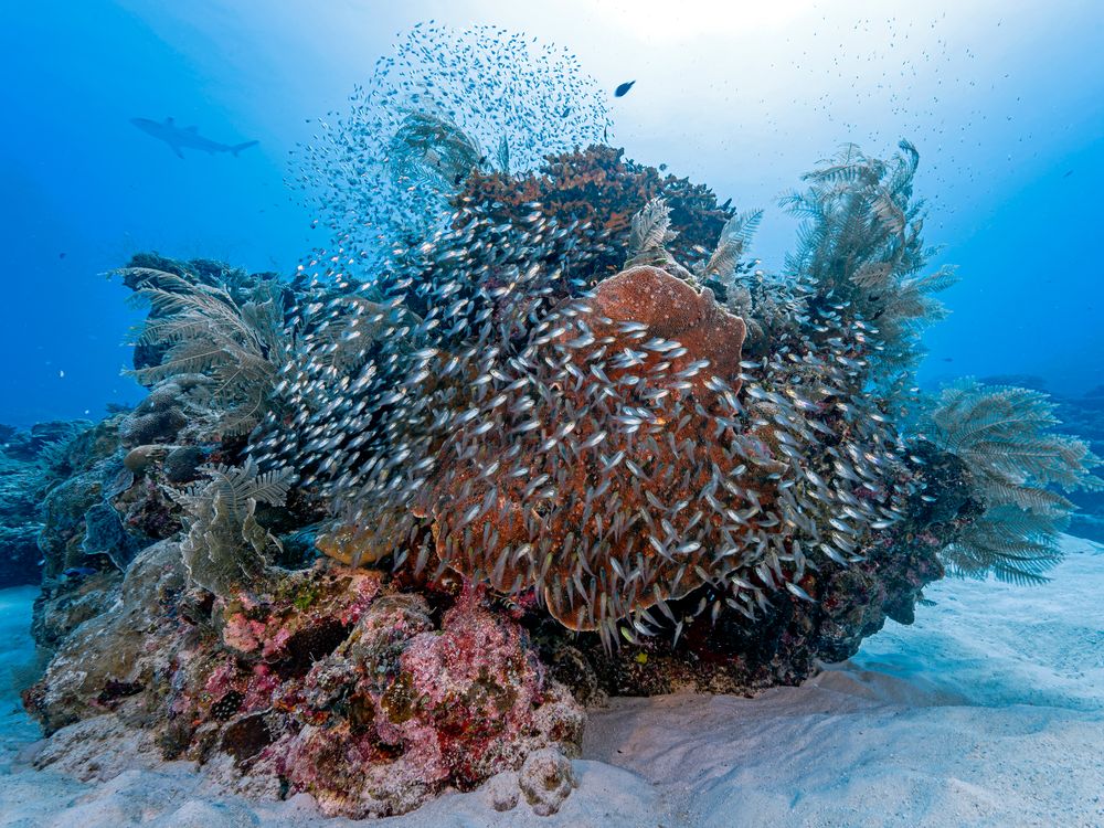 Embark on an underwater odyssey in Palau, where a coral pinnacle stands as a vibrant oasis, embraced by a swirl of tiny fish. In the backdrop, a graceful shark silhouette adds an element of mystery.