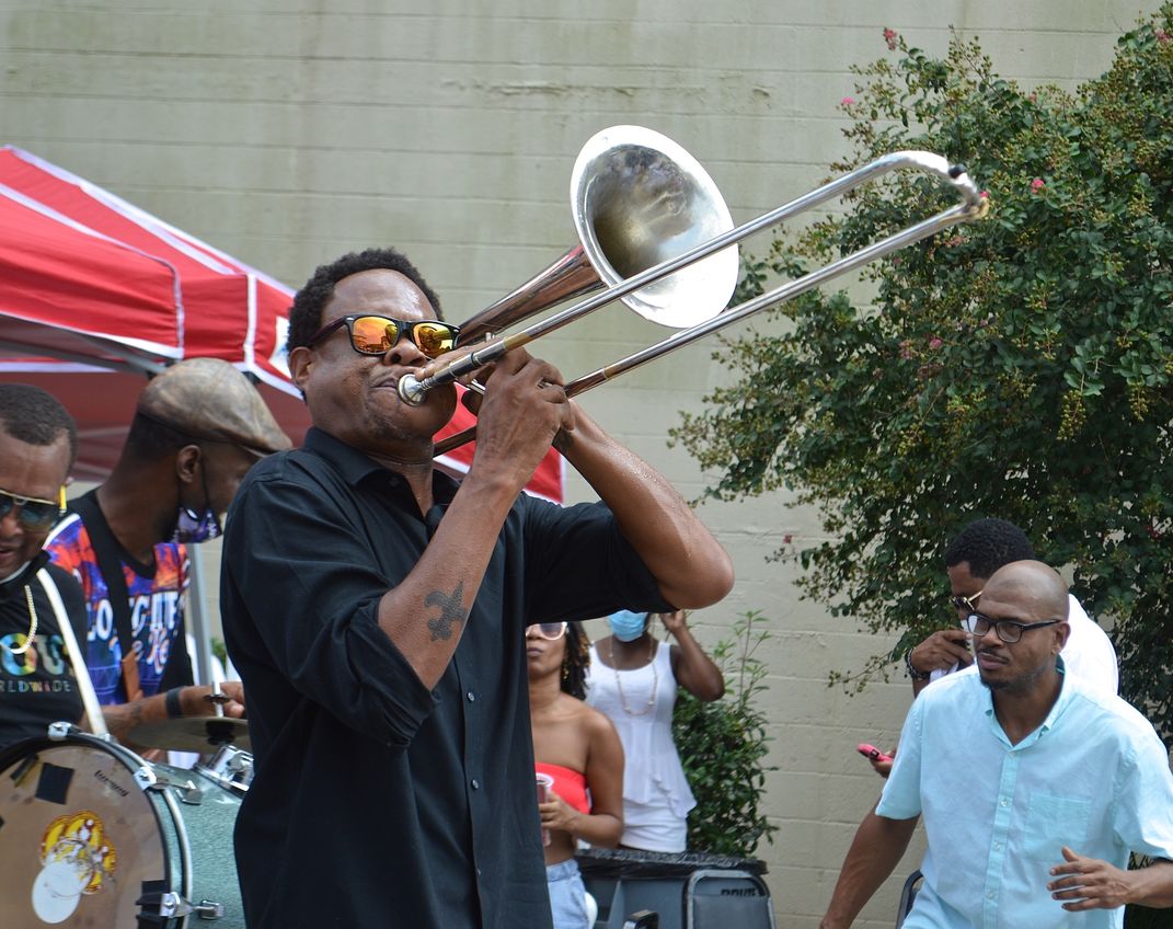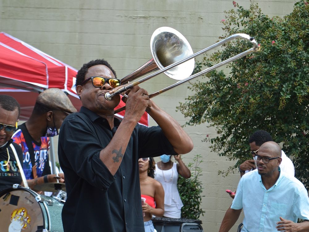 Corey Henry and Soul Brass Band play in honor of the life and legacy of Lawrence "Keng" Harvey at Ashe Cultural Arts Center in New Orleans.