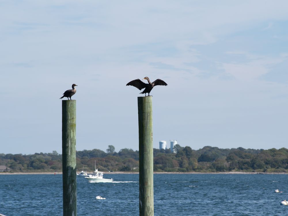 Cormorant's sitting on a pole while one dries their wings after catching and eating fish.