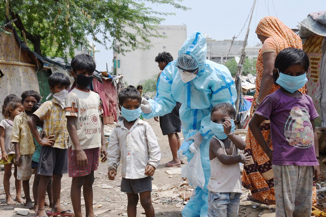 Health worker wearing PPE Kit giving face masks to urban street children in a slum for Covid 19 Coronavirus awareness in New Delhi, India. Photo by Sondeep Shankar