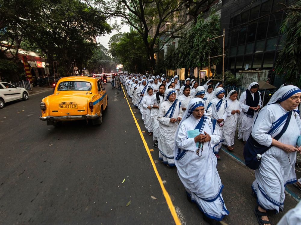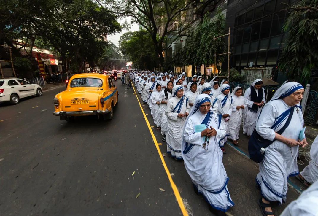 A serene Corpus Christi procession moves through the heart of Kolkata, as nuns in white and blue habits walk in prayerful unity beside the city’s iconic yellow taxi—faith and everyday life flowing side by side on a busy urban street.