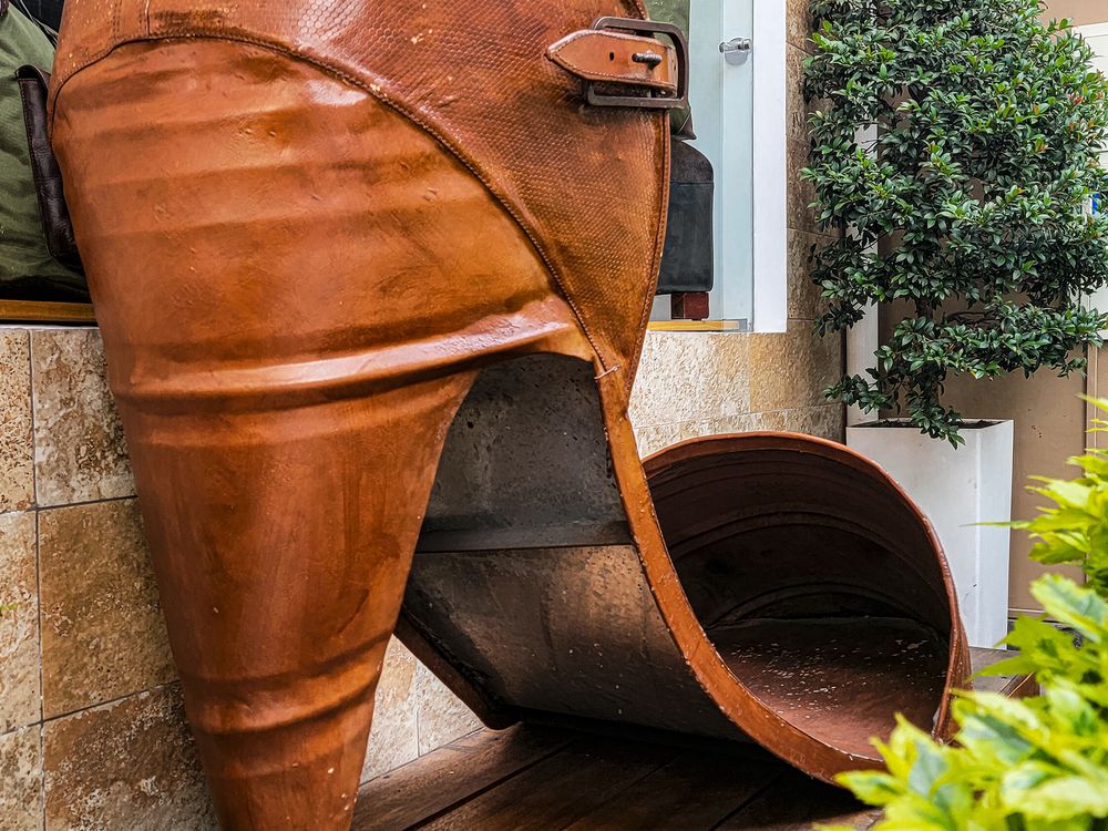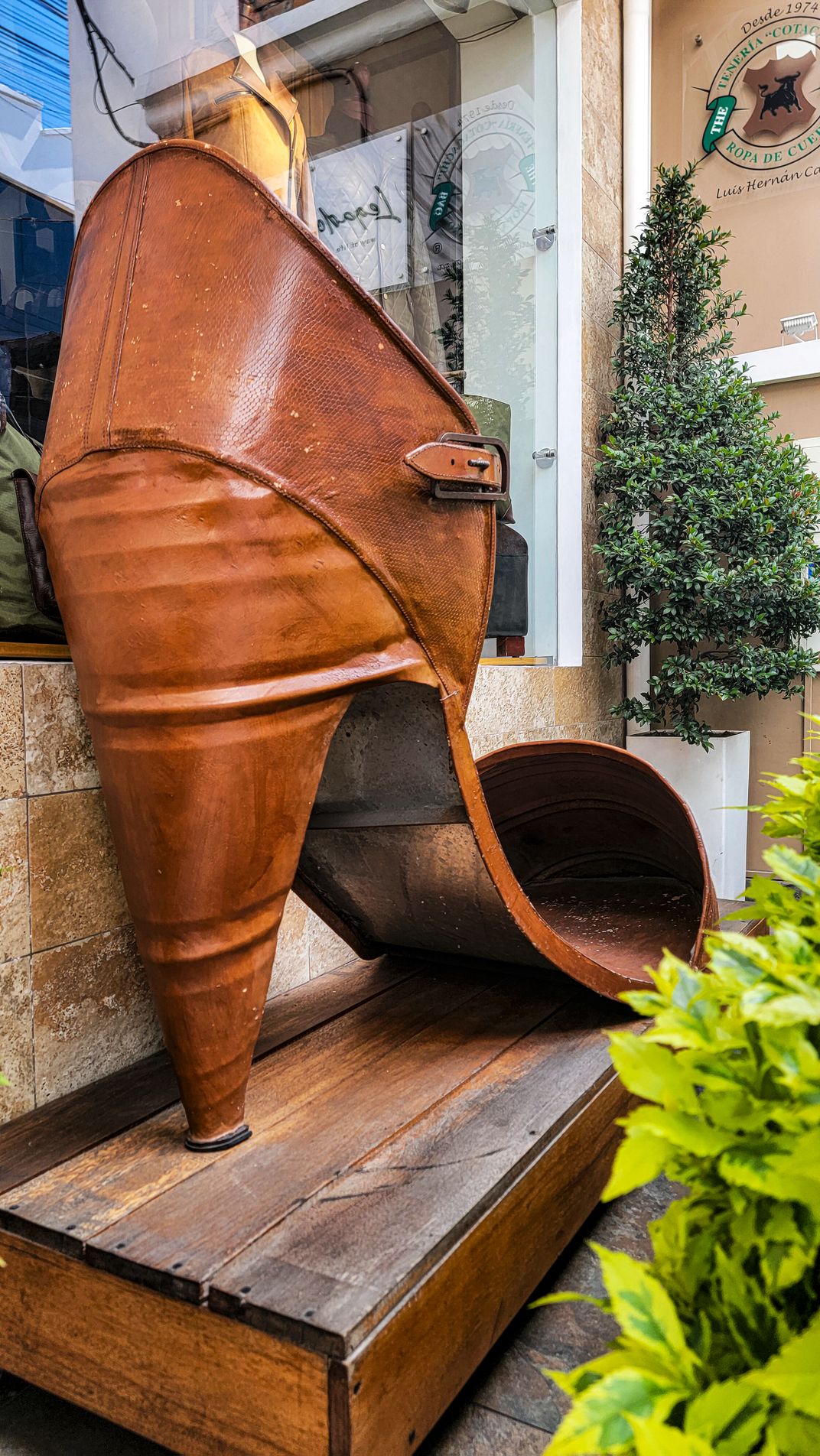 Captured in Cotacachi, Ecuador, on May 18, 2024, this image presents a monumental representation of local artisan history. Cotacachi is globally renowned for its high-quality leather craftsmanship, a heritage celebrated through this witty and oversized public sculpture. The structure—a giant, elegantly curved high-heeled shoe—is fabricated from the very material the town is famous for, set deliberately on a rustic wooden stand against a backdrop of local street life and greenery. The composition uses the sculpture's dramatic scale and unexpected context to pay homage to the enduring skill and charm of the city's leatherworkers.