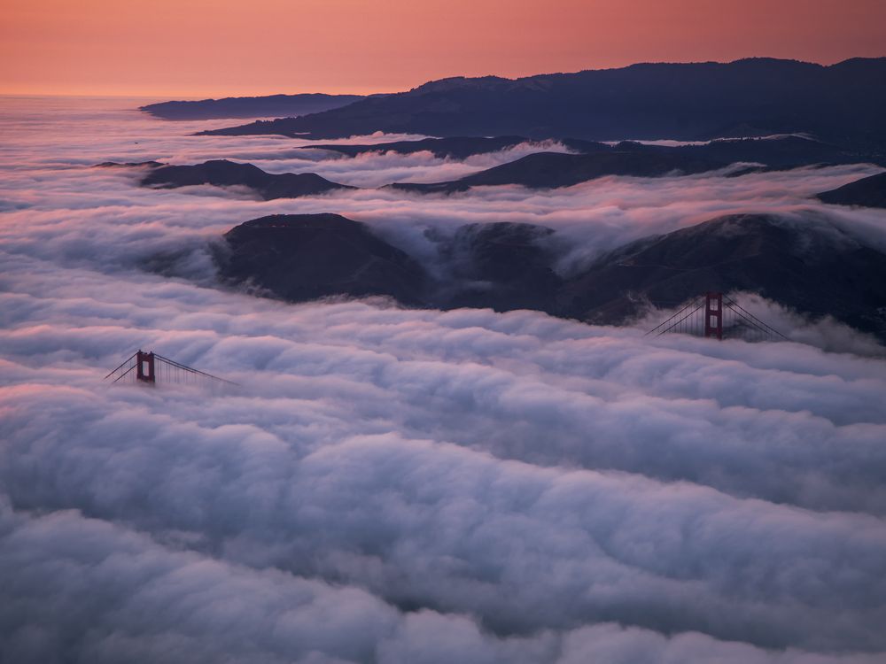 A low fog sunset at Golden Gate Bridge taken from a small airplane.