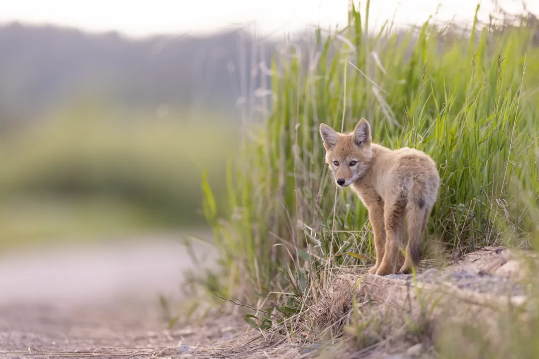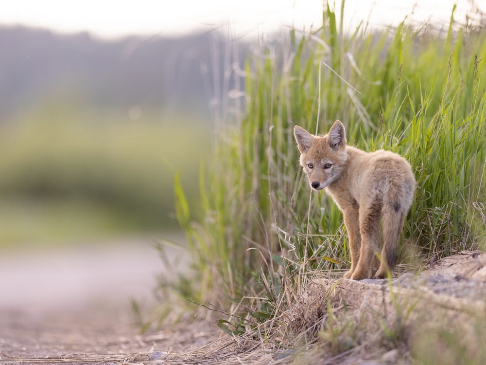A coyote pup pauses at the edge of a dirt road, after a long day of playing with his siblings.