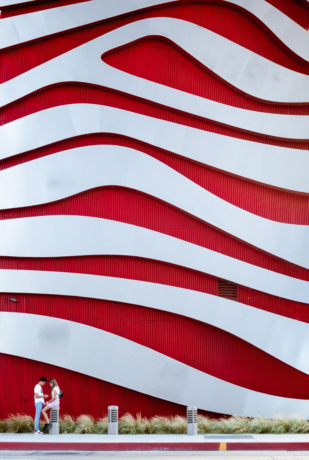 A couple having a quiet moment outside of the Petersen Automotive Museum in Los Angeles, California.