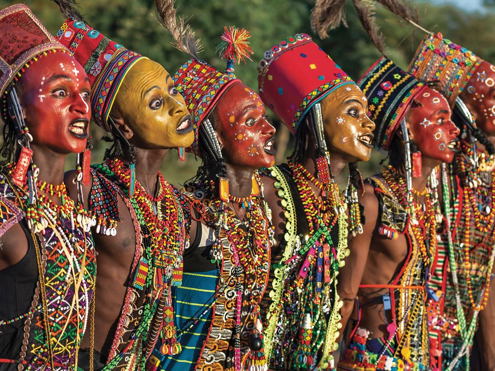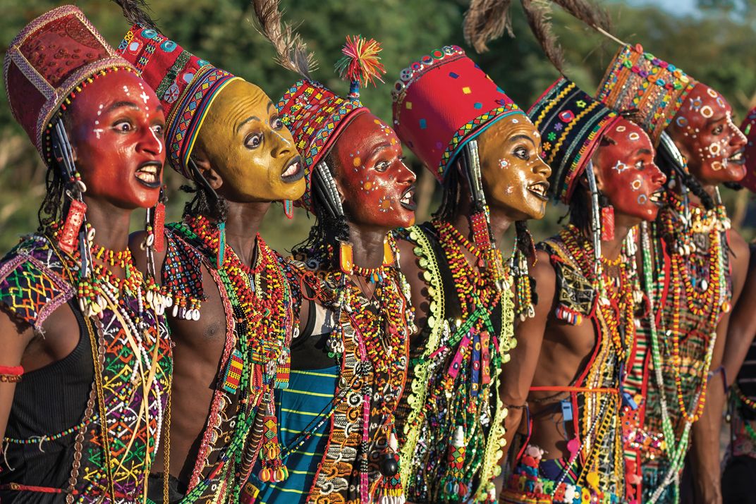 Group of Sudosukai – Wodaabe people celebrating the Gerewol festival at sunset (Chad). The Gerewol is an annual courtship ritual and competition mainly among the nomadic peoples of Niger and Chad. It is a beauty pageant for young men, who hope to be chosen by the girls of the tribe. The young men, adorned in elaborate ornaments and traditional face paint, gather in lines to dance and sing, competing for the attention of marriageable young women. The Gerewol takes place each year when the traditionally nomadic Wodaabe cattle herders meet at the southern edge of the Sahara before moving south to their dry season grazing lands.