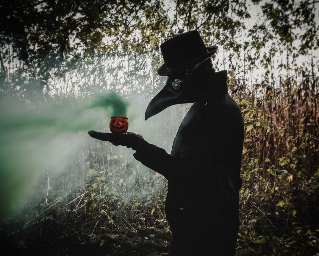 Halloween costume during covid. Smoke bomb in pumpkin for plague effect.