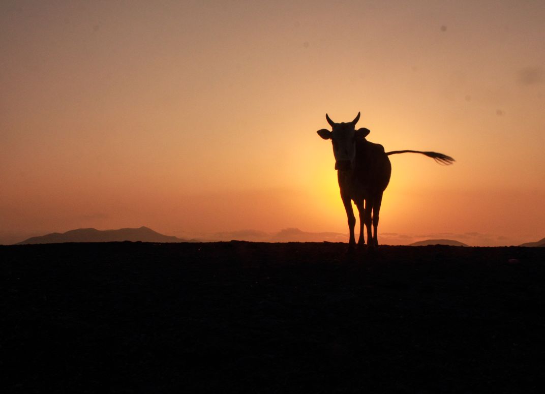 Silhouette of Cow @ Sunset on Hill top. I love climbing the hills and the picturesque grasslands. I was enjoying the greens, just after the rainy season on the hill top and it was sunset time. The cow was right in between me and the sun on the hill top, so positioned myself to take this silhouette against the setting sun.The cow swung its tail probably to poop, added to the scene.