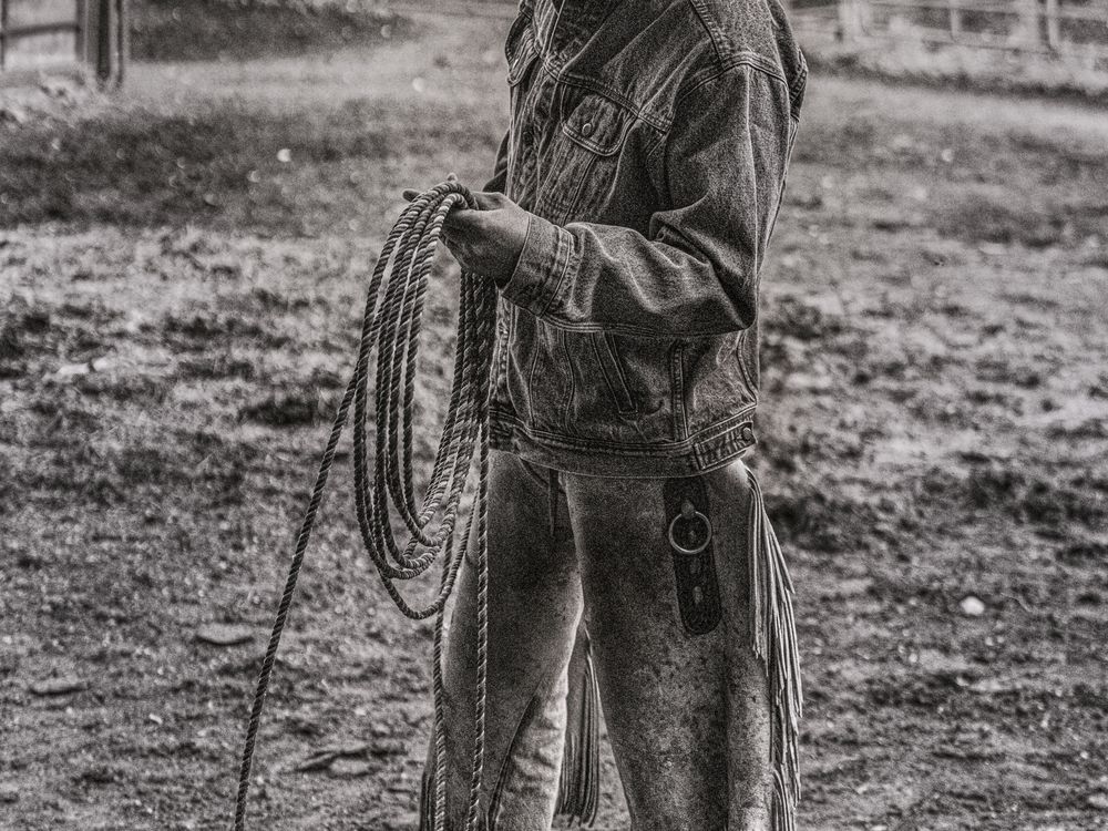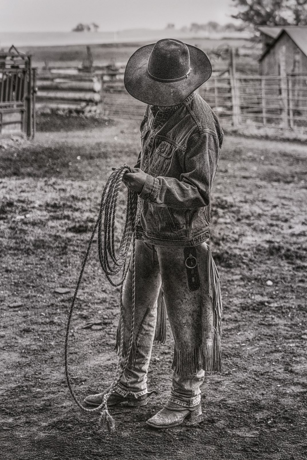 A lone cowboy takes stock of his equipment and perhaps of himself at the end of an evening roundup, a tough and taxing chore on a working cattle ranch.