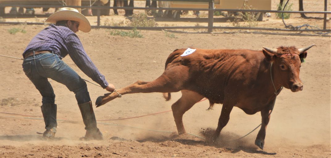 Unidentified Cowboy roping a cow at a local rodeo in Southern, Colorado