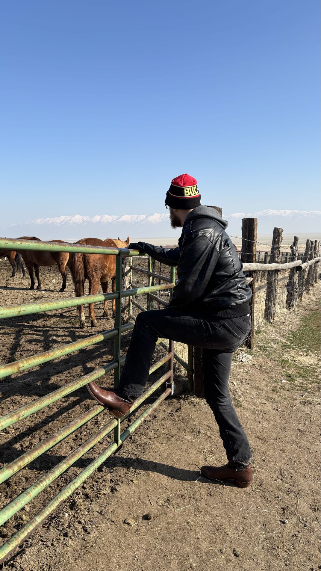A young man in cowboy boots stares intently at the horses in the pen with the snow capped mountains in the background after a recent snow storm has blown through in Utah on antelope island.