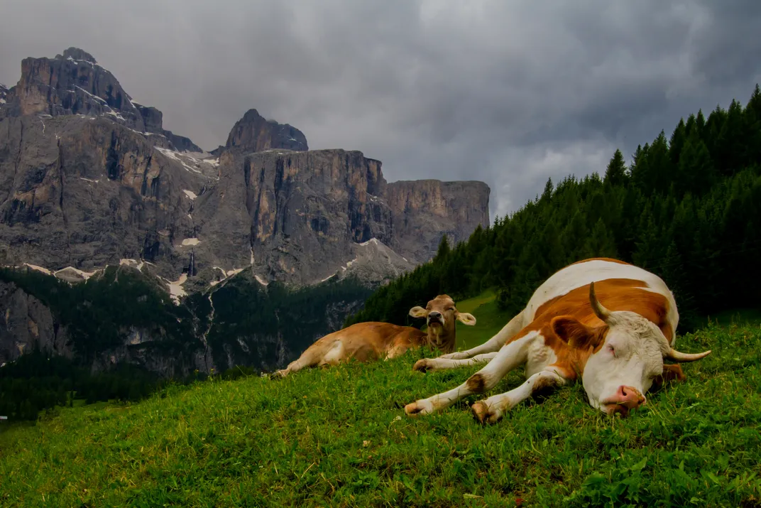 Cows enjoying a slower life in the Dolomite mountains of Italy.