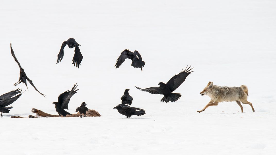 A coyote moving in on an elk carcass in Yellowstone National Park.
