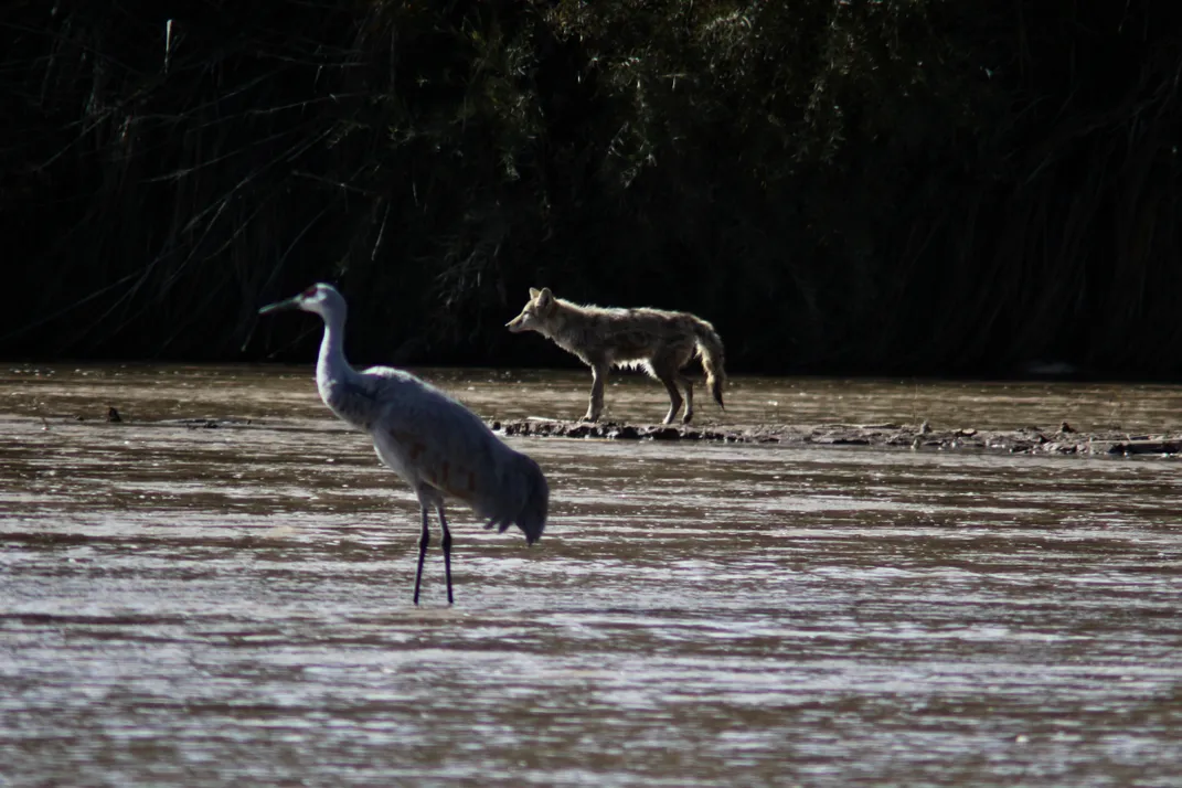 A young coyote stalks a sandhill crane in the Rio Grande River at the Rio Grande State Park in New Mexico.