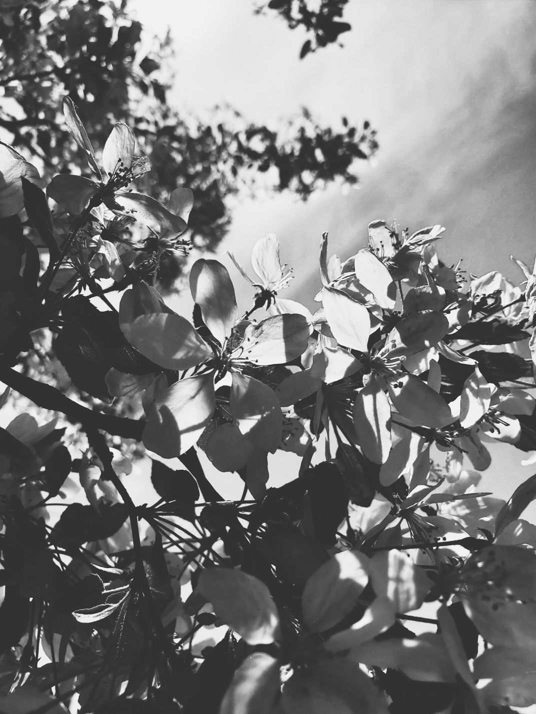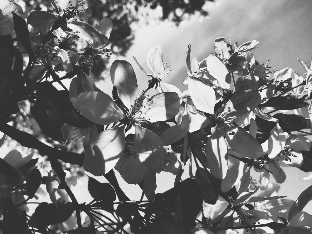 This is an up close photo of Crab Apple Blossoms with the sun coming through the branches. And in the background you see some more of the tree and the sky up above.