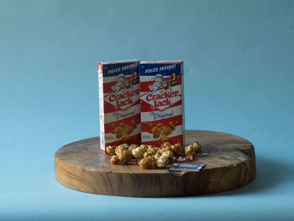 I used to walk around the house singing jingles for consumer products as a child. “It’s so easy when you use Lestoil!” “No chocolate mess!” I can laugh about it now. But I admit that I am partly defined by household products, so I made art out of them. The image of Cracker Jacks glorified on top of a wood pedestal recalls the excitement and anticipation of finding a prize inside the box; the boxes are a metaphor for an optimistic America spirit.