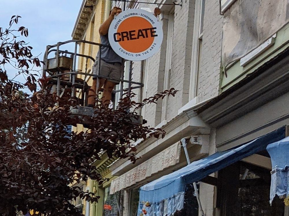 A workman in a forklift in Catskill NY was putting up the sign ” CREATE” for the Council on the Arts : Greene- Columbia - Schohaire. Underneath is one of the cat sculptures that go up in Catskill, NY and are auctioned after Labor Day in September to raise funds for the town