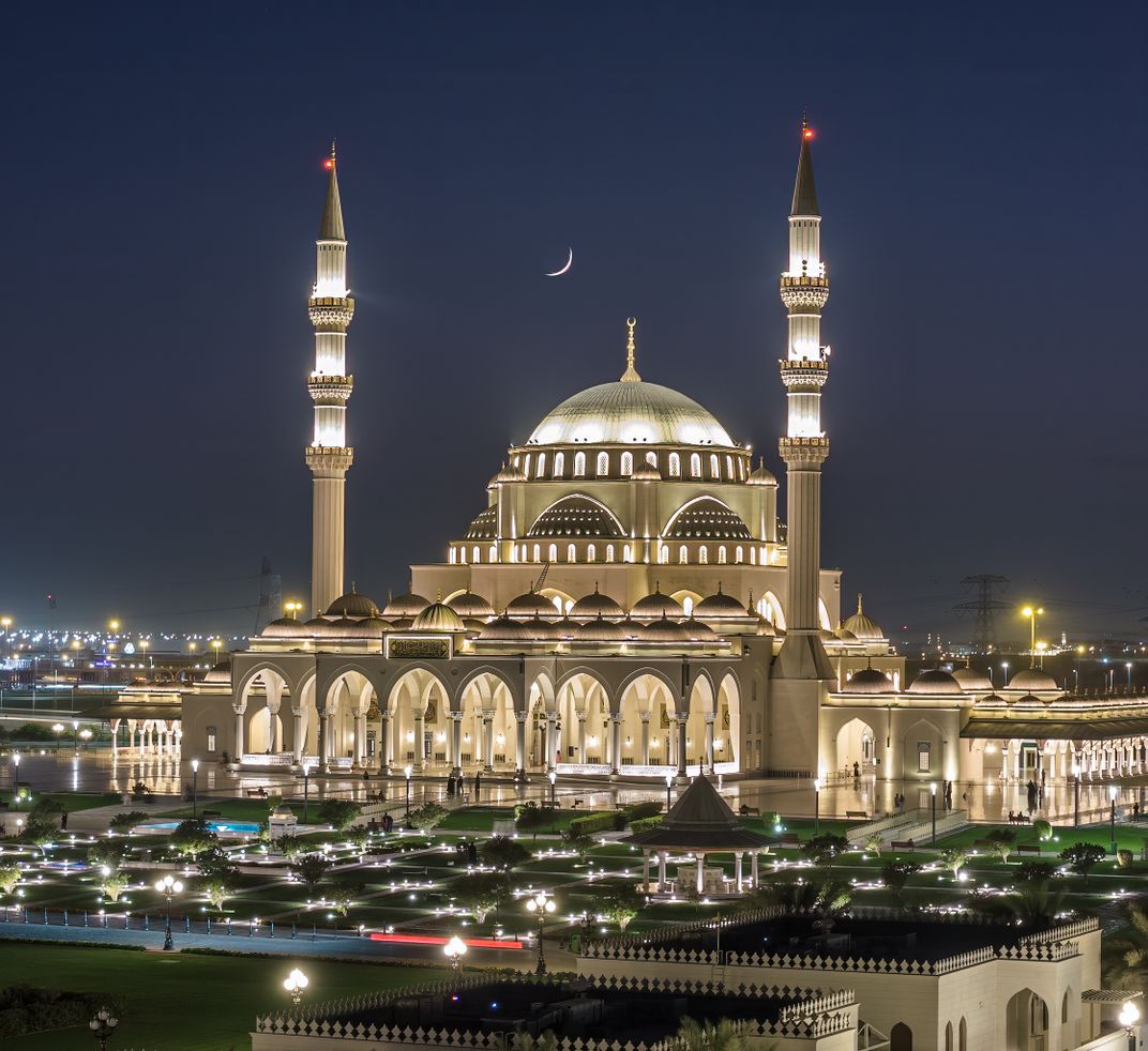 A crescent moon over the Sharjah Mosque in Sharjah, United Arab Emirates