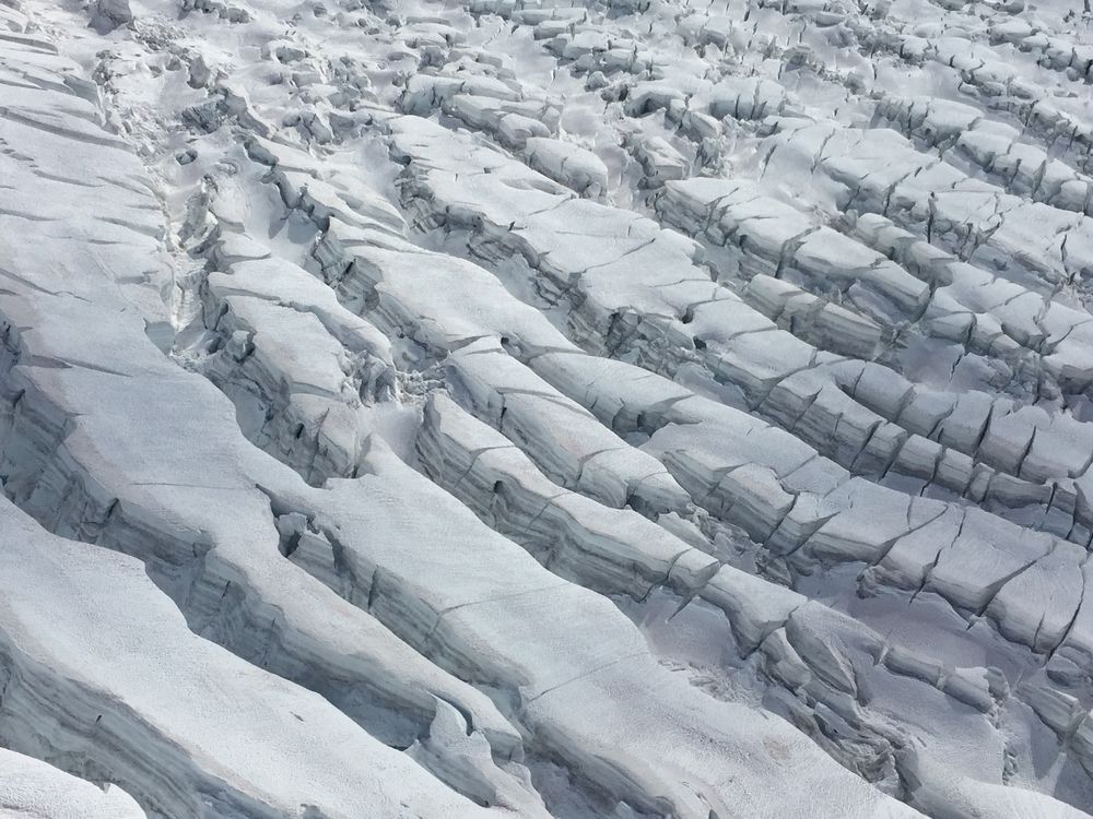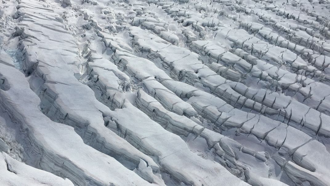 Crevasses of Ruth Glacier in Denali National Park and Preserve. Crevasses are deep cracks in glaciers that can be hundreds to thousands of feet deep.