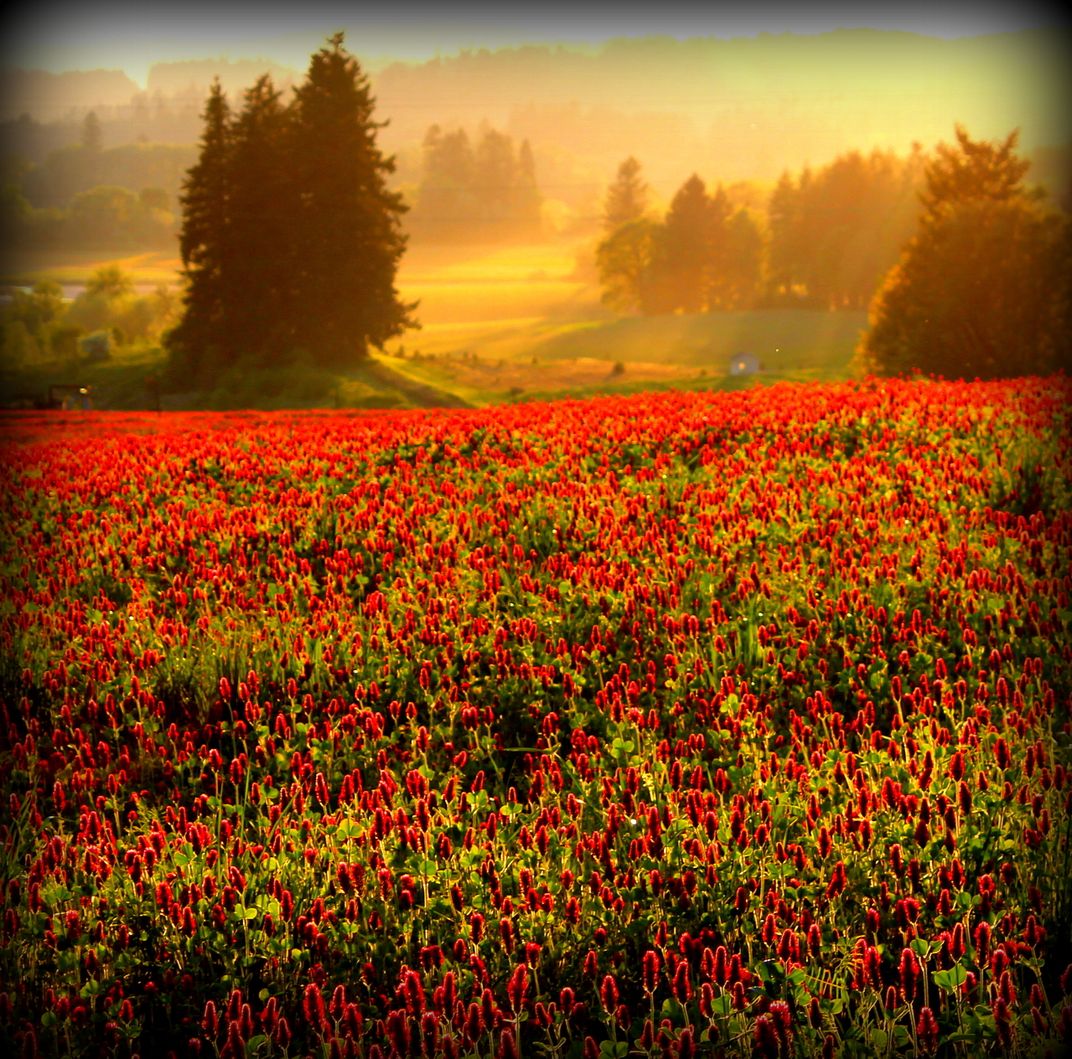 I waited for the crimson clover near our property to be in full bloom. This picture was taken the first of May just before sunset. Our farm is in the background on the right. I was waiting for the sunlight to be low enough to reflect on the field and trees on our property. I was captivated by the vivid color of the clover and the light on the fields as the sun set over our farm.