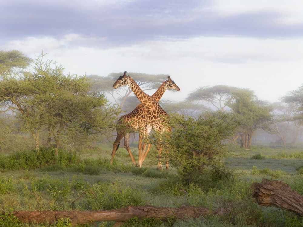 After an early morning rainstorm in the Serengeti, the sun broke through the clouds and lit up these two giraffes amongst the Acacia trees.