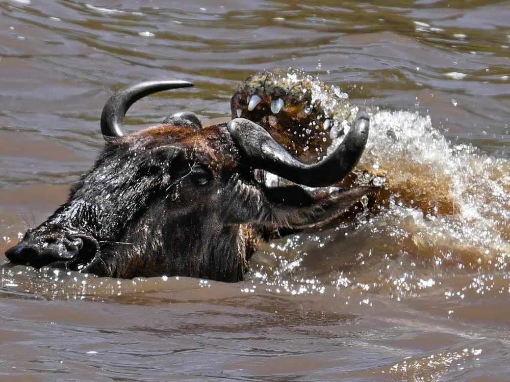 A crocodile's jaws are set to clamp onto a wildebeest during the perilous Mara River crossing in Tanzania’s northern Serengeti, a stark reminder of the life-and-death battles that unfold during the Great Migration. Each year, millions of wildebeest risk it all to cross the river, but for some, the journey ends in the crushing jaws of Africa’s top river predator.