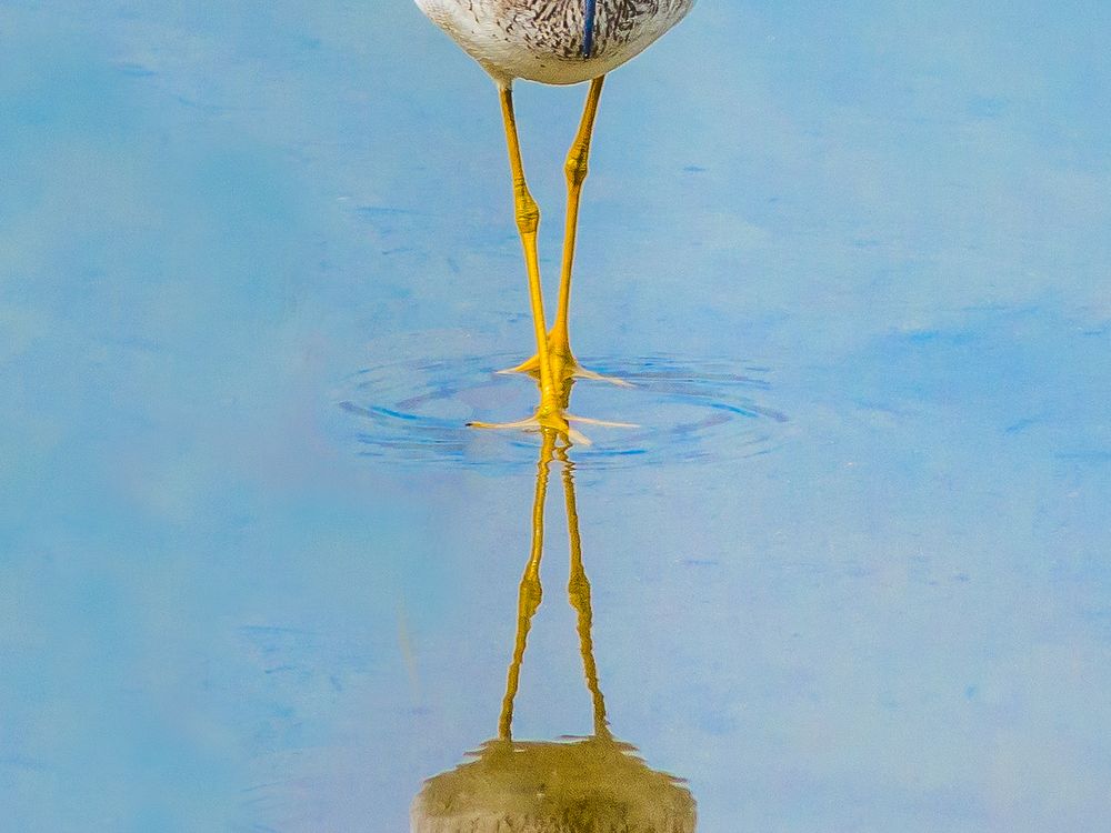 "Cross-legged" Yellowlegs shorebird admires its reflection in a salt marsh adjacent to Parsons Beach in Kennebunk, Maine