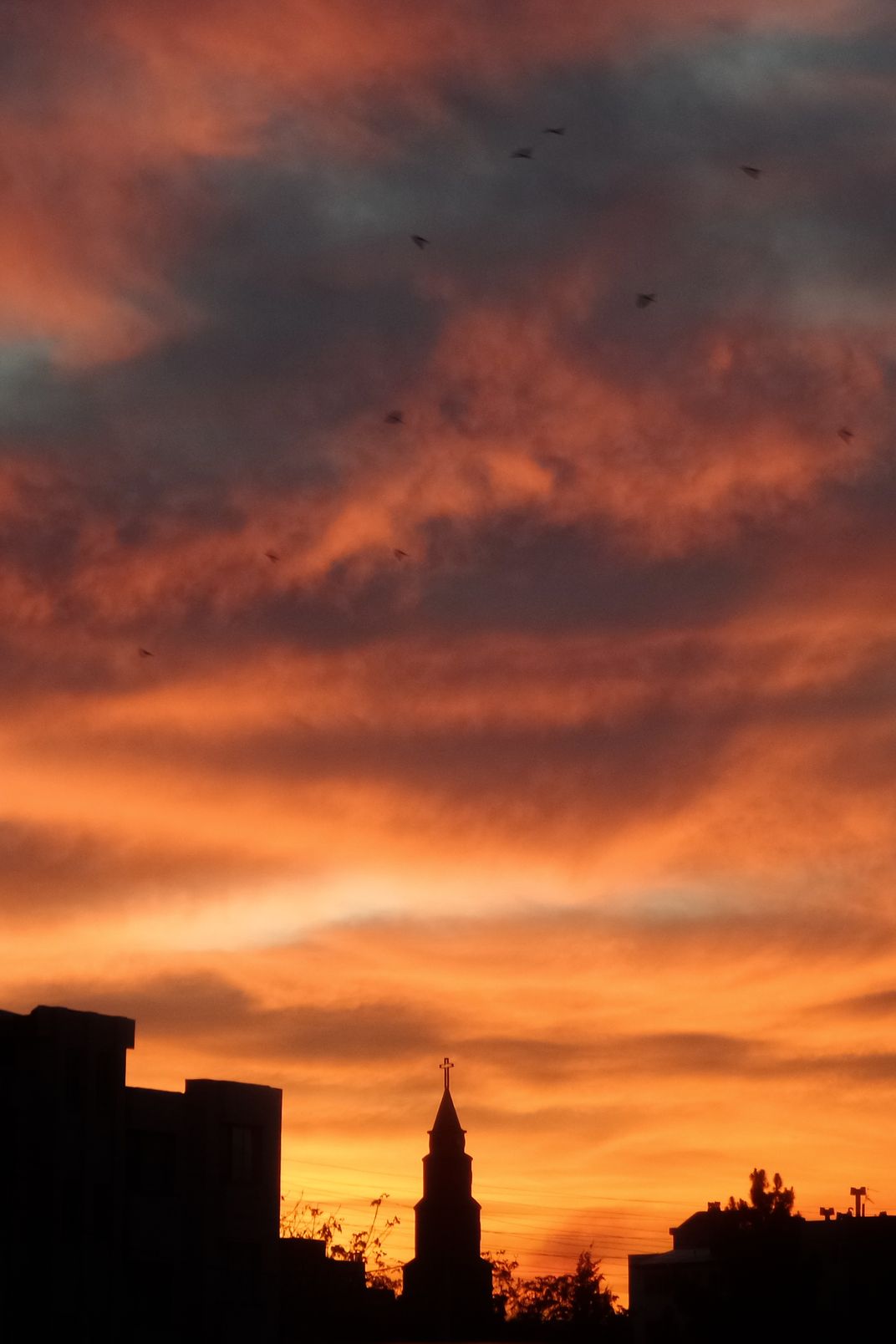 a colorful sunset in the streets of Tabriz, making the hollow cross of the church light up in the shimmering rays of the setting sun