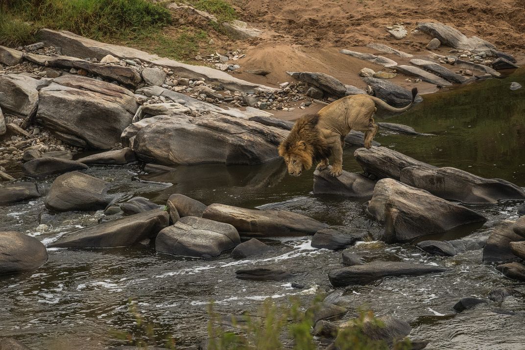 A lion steps carefully across the Mara River after leaving his mating partner, entering another male’s territory. Each rock he tests reflects the tension of the moment, pure raw instinct, risk, and quiet determination in the heart of the Masai Mara.